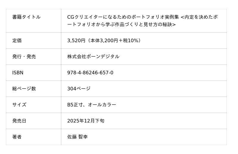 株式会社ボーンデジタル(本社:東京都千代田区、CEO:新 和也、URL:https://www.borndigital.co.jp)は、『CGクリエイターになるためのポートフォリオ実例集 <内定を決めたポートフォリオから学ぶ作品づくりと見せ方の秘訣>』(著:佐藤 智幸)を2025年12月下旬に発売いたします。