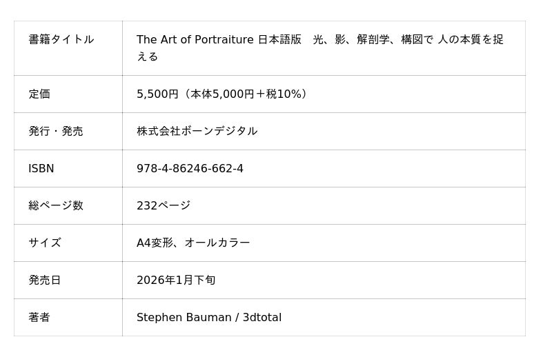 株式会社ボーンデジタル(本社:東京都千代田区、CEO:新 和也、URL:https://www.borndigital.co.jp)は、『The Art of Portraiture 日本語版 人を描く秘訣。光、影、解剖学、構図で 人の本質を捉える』(著:Stephen Bauman / 3dtotal)を2026年1月下旬に発売いたします。