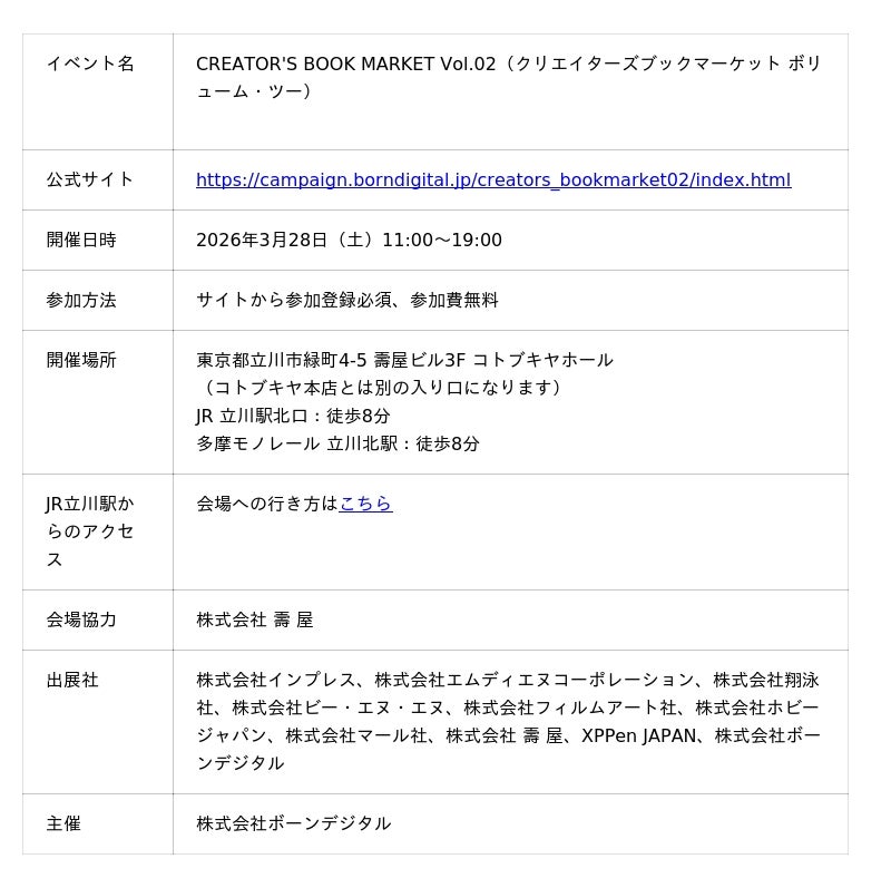 株式会社ボーンデジタル(本社:東京都千代田区、CEO:新 和也、URL:https://www.borndigital.co.jp)は、『CREATOR'S BOOK MARKET Vol.02』を2026年3月28日(土)に開催いたします。