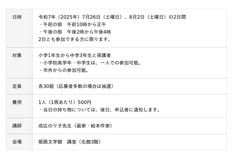 ハガキ・ファクス・姫路文学館ホームページ(受講申込フォーム)のいずれかで、(1)希望の時間帯(「午前の部希望」「午後の部希望」「どちらでもよい」のいずれか)、(2)参加される児童・生徒のお名前(ふりがな)、学校名、学年、保護者名、(3)郵便番号・住所、(4)電話番号を記入して、下記宛先までお申し込みください。