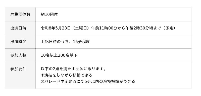 - 募集期間終了後、ご提出いただいた内容をもとに出場可否、出場場所、出場順を姫路お城まつり選考委員会で選考の上、決定します- 選考結果は3月上旬以降、順次メールまたは文書で通知予定です