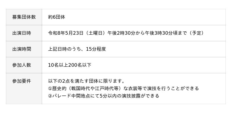 戦国時代や江戸時代等の歴史を感じることができる衣装や演出にて、観客を楽しませることができる団体からの応募を期待します。※キャッスルパレードにご応募いただいても問題ありません