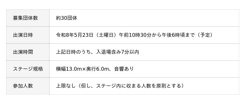 姫路城下にある大手前公園(メイン会場)にある特設ステージにて、多くの観客が笑顔になる楽しい演出を披露いただける団体からの応募を期待します。