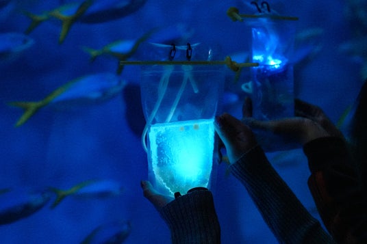 春休み期間の17時から「アクアライブ」館内のBGMと照明が切り替わり、幻想的な光の演出とともに昼間と異なる夜間の生きものを観察できる限定プログラムです。