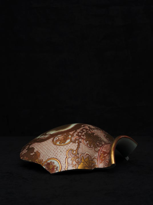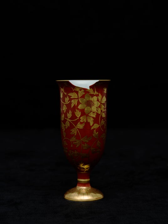 本展覧会では、2024年元日に発生した能登半島地震で被災した九谷焼窯元 「錦山窯」 の名作を、写真家・蓮井幹生が1億画素の超高精細カメラで撮影した写真作品を展示。割れ、欠け、崩れた九谷焼の姿を、破壊の中に生まれる新たな美として捉えた作品群が並びます。作品の撮影にあたっては、背景を漆黒に統一し、損壊のディテールを際立たせることで、陶器が持つ繊細な質感と、時間や自然災害が刻んだ痕跡を鮮明に可視化。単なる記録を超え、人間と自然、人間と物質の拮抗関係、再生への希望を宿したヴィジュアルへと昇華させています。