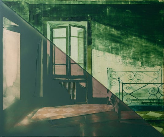菅雄嗣は、CGによる既視感を伴う空間イメージを題材に、キャンバスを二分割しながら、絵の具を「塗る」「削る」という対照的なプロセスを融合させる独自の手法を用いています。異なる技法や質感を組み合わせることで、現実とフィクションの境界を行き来するような表現を生み出しています。
