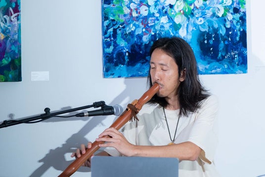 音楽で共演したのは、糸島在住の音楽家 KOKU氏。11年ほど海外に拠点を置き、ハンドパンやディジュリドゥの演奏家、そしてDJとして、世界各地のフェスやイベントに出演。今年3月より福岡へ拠点を移動。パフォーマンスでは自然の気配を感じさせるハンドパンの音色や、水の流れと森の空気が漂うビートで絵と舞の空間にやさしく寄り添い、命のリズムを奏でてくださいました。