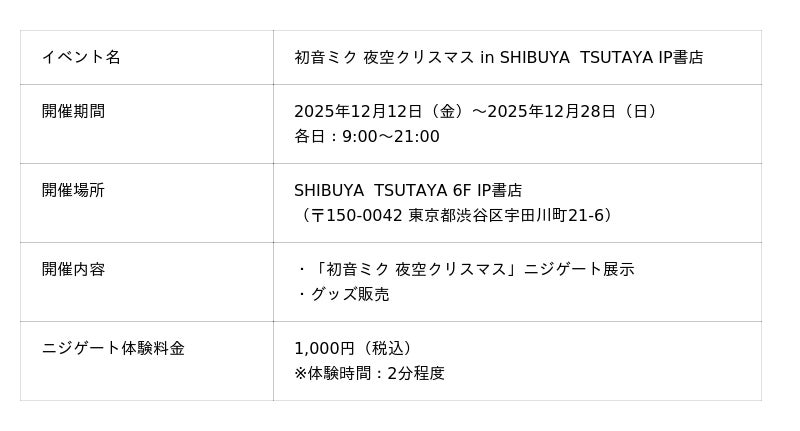株式会社Gugenka(代表取締役CEO 三上昌史)は、2025年12月12日(金)より、SHIBUYA TSUTAYA IP書店にて「初音ミク 夜空クリスマス in SHIBUYA TSUTAYA IP書店」を開催することをお知らせいたします。