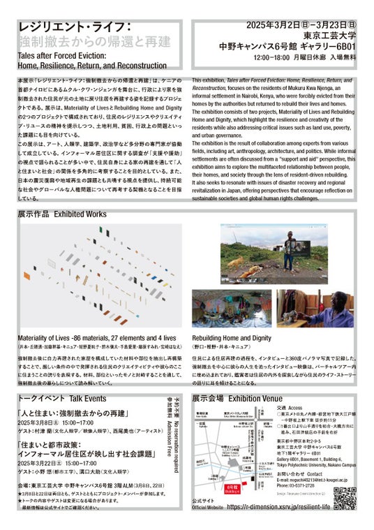 東京工芸大学芸術学部(学長:吉野弘章、所在地:東京都中野区 以下、本学)は、「レジリエント・ライフ:強制撤去からの帰還と再建」展(以下、本展)を開催します。