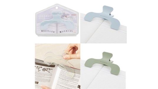 本の見たいページを開いてキープできるクリップです。“ウカンムリ”の形が書籍やノートの中央部分を避けるため、内容を隠さず留めることができます。勉強時のほか、料理中のレシピ本への使用もおすすめです。「ぷち」はレギュラーサイズの約25%のサイズ感で、手帳やメモを留めるのにぴったりです。
