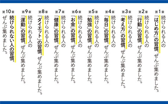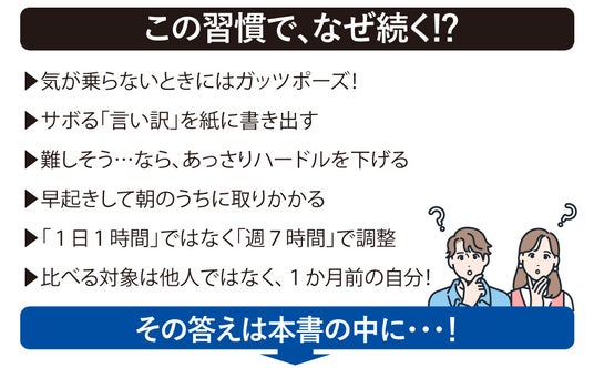 本書では、「続けられる人」の習慣を、日常生活、行動心理、メンタル、思考法、脳科学など、さまざまな側面から紹介します。