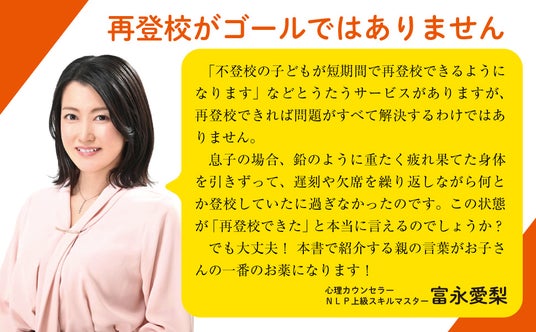 息子の不登校を経験した著者は、「当事者の親の経験からいえば、実は、再登校してからの『行きしぶり』の期間が長くて大変。でも親の効果的な言葉がけによって、わが子の心身の状態を親自身の力で救い出してあげることができます」といいます。