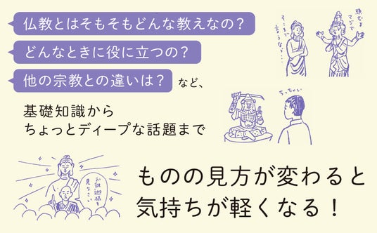 「仏教とはそもそもどんな教えなの?」「どんなときに役に立つの?」「他の宗教との違いは?」「日本って葬式仏教のイメージが強いけど、本当のところはどうなの?」「おなじみの仏教行事の意味は?」など、基礎知識からちょっとディープな話題まで、ざっくりまとめられています。
