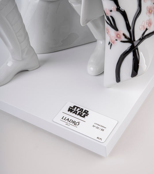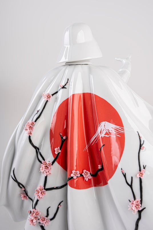 この印象的な「ダース・ベイダー(桜)」はホワイトのポーセリン作品で、背中のマントには木の枝に咲く80個の繊細な花で彩られています。日本へのオマージュとして、マントには日の丸が、その中心には富士山のシルエットが描かれています。マントの裏地には、手で描かれた浮き彫りの花があしらわれています。「ダース・ベイダー(桜)」は、『スター・ウォーズ』作品の持つ力強さと、日本の奥深さを融合させた作品です。