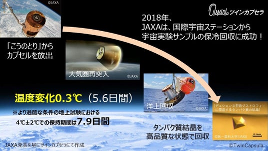 JAXAが国際宇宙ステーションから日本独自の物資回収技術を実証するために開発した再突入カプセル。2018年11月に宇宙実験で生成したタンパク質結晶を4℃に維持した状態で回収することに成功。大気圏再突入中も含めた回収までの5.6日間の断熱保冷容器内のサンプルの温度変化は0.3℃と高い断熱保冷性能が実証されており、ツインカプセラはこの技術を継承しています。