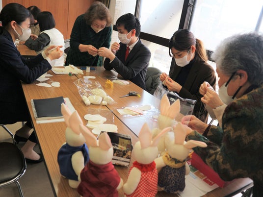 大治町に出向き、「雅の会」皆様に教えていただき、ホテルオリジナルマスコットの「マリオットラビット」を模した雛を17個制作。その衣装は、着物や布などの古布からSDGsカラーホイールの17色をイメージして選んでいます。