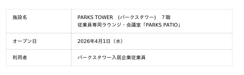 難波のランドマーク、なんばパークス内のオフィスビル「パークスタワー」の7階共用部を、従業員専用ラウンジ・会議室「PARKS PATIO(パークスパティオ)」として2026年4月1日(水)にリニューアルオープンしました。なんばパークスの象徴である緑豊かなパークスガーデンと呼応する、“働く人のための特別な裏庭”のような空間として計画。働く人が日常的に利用できる場として、打ち合わせや作業だけでなく、休憩や気分転換など多様な過ごし方を受け止める環境を整備しました。
