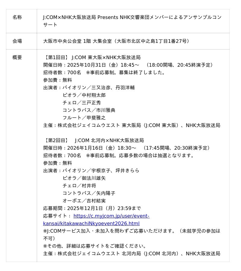 株式会社ジェイコムウエスト(J:COM、本社:大阪府大阪市、代表取締役社長:植田展生)とNHK大阪放送局は、2025年10月31日(金)と2026年1月16日(金)に、J:COMが指定管理者として施設管理・運営を行う「大阪市中央公会堂」で、NHK交響楽団メンバーによるアンサンブルコンサートを開催し、合計1,400名様(各回700名様)をご招待します。なお、J:COMが指定管理者となってから、主催イベントを大阪市中央公会堂で開催することは初めてです。