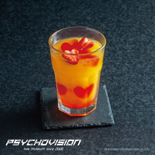 <ドリンクメニュー>税込930円。hide愛用のギター「イエローハート」柄をイメージ。シトラスフルーツのレモネードにハートのジュレといちごをあしらいました。見た目はポップで愛らしく、飲むとスッキリ凛とした味わい。ノンアルコール/アルコール