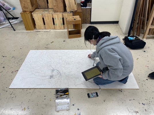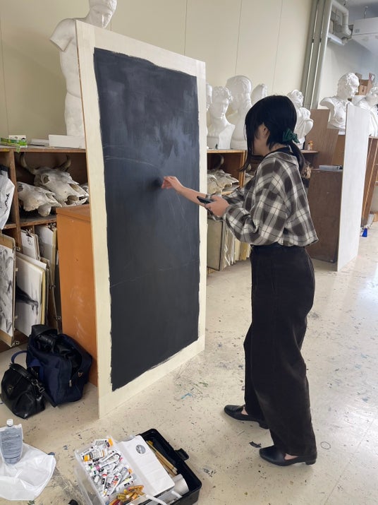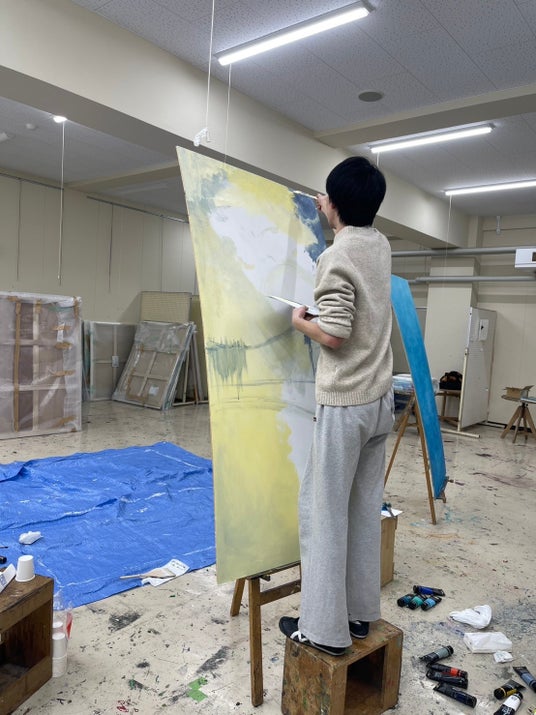 弊社が2021年に「人間にも地球にもよい循環」をコンセプトに立ち上げた『GOOD CYCLE PROJECT』の理念やキーワードなどを踏まえ、学生16名(卒業生含む)と、担当教員の黄教授が絵画を制作しました。絵画は3×6版サイズのベニヤ板を使用して制作されました。参加学生の多くが大学1年生(制作当時)ということもあり、初めて大判の絵画を制作された方も多くいました。