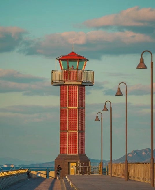 夕方の光が高松港玉藻防波堤灯台の赤いガラスブロックにフラットに当たり、どこか異世界的な雰囲気を醸し出しています。黄昏時(逢う魔が時)特有の不穏さと静けさが漂う、日常と非日常が交錯する瞬間を見事に捉えた一枚です。
