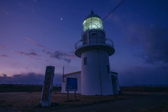 襟裳岬灯台の夜明け前、暴風雨の風が雲を吹き払い、細い月が顔をのぞかせた瞬間を見事に捉えた一枚です。夜明け間近の静寂さと、灯台の放つ温かな光が絶妙な調和を生み出し、ドラマチックな情景を描き出しています。灯台の威厳と自然の力が響き合う、美しい「灯台時間」を感じさせる作品です。