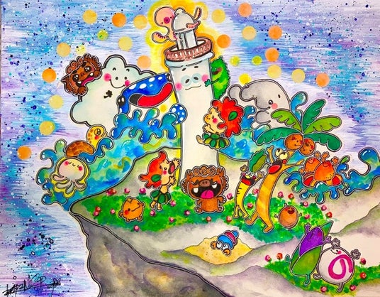 ポップな色彩と愛らしいキャラクターで、残波岬灯台と周囲を取り巻く海や動植物たちなどを生き生きと描いてくださいました。地域の自然や文化と共にある灯台の魅力をユニークに表現した、楽しくて親しみやすい一枚です。