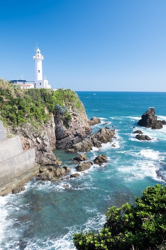 青く透き通る海と白い灯台のコントラストが美しく、さわやかな風を感じさせます。灯台が立つ崖の緑と荒々しい岩場が自然の力強さを際立たせ、歴史ある灯台の存在感を引き立てています。灯台が海と共にあり、航海の安全を見守る象徴であることを強く感じさせる一枚です。