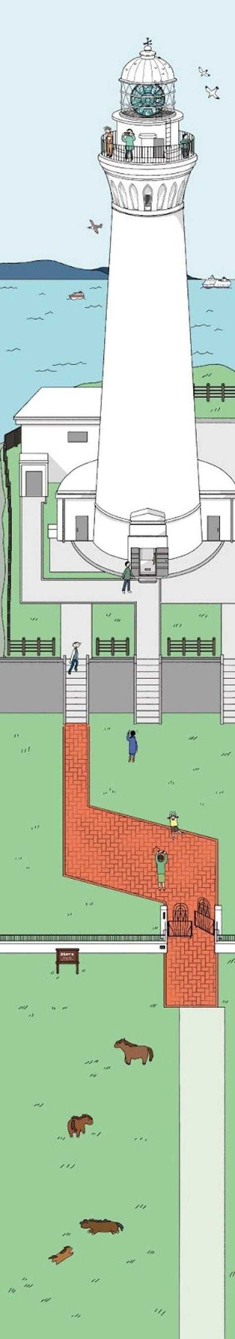 シンプルな線描と穏やかな色使いで、灯台を中心とした風景の広がりを描いてくださいました。灯台の下に広がる草原と放牧された馬たちが自然との調和を感じさせ、訪れた人々の姿が「灯台時間」の穏やかさを伝えています。