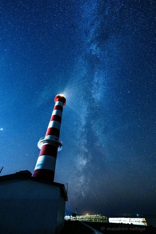 赤と白の稚内灯台と夜空の深い青に映える天の川が織りなす壮大な光景が印象的です。縦構図を巧みに活用し、航海の目印という共通点を持つ「星と灯台」が織りなす壮大な物語を詩的に表現した素晴らしい一枚です。