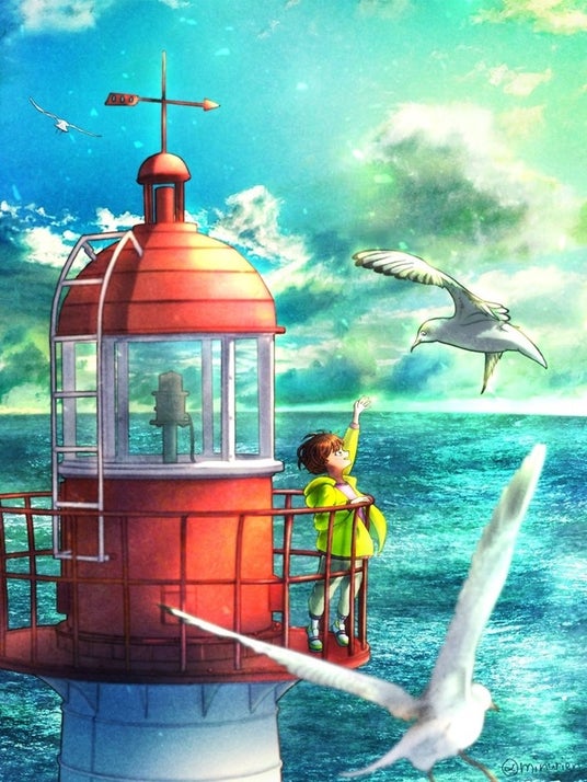 力強い色彩と動きのある構図が、灯台とその周辺の魅力を生き生きと描き出した素晴らしい作品です。海鳥とのふれあいが温かさを生み出し、灯台が自然と人々をつなぐ場であることを象徴的に表現しています。