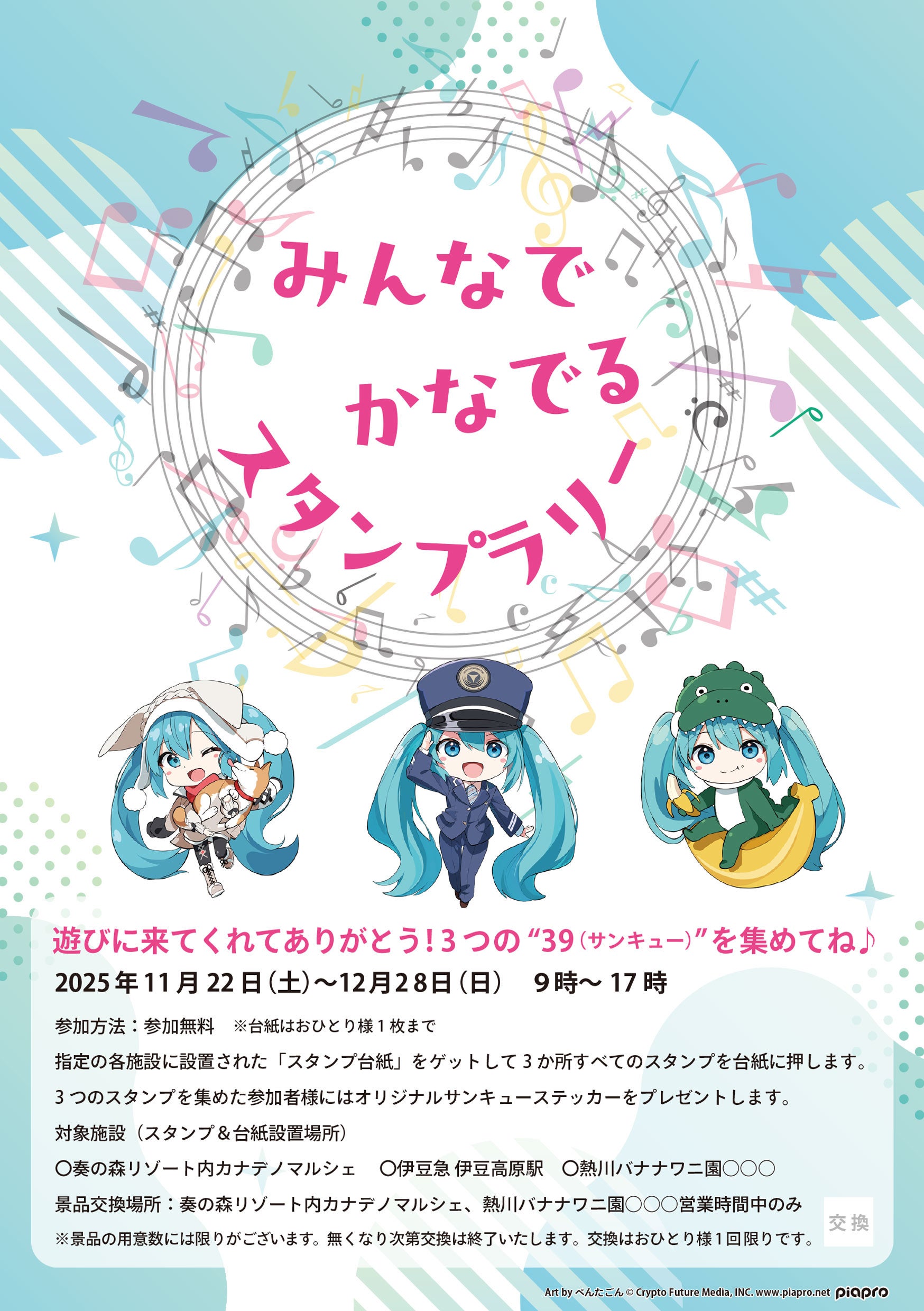 今回も様々なコンテンツをご用意していますが、中でも注目は、伊豆高原駅(伊豆急行)・熱川バナナワニ園・奏の森リゾートの3施設を巡る「みんなでかなでるスタンプラリー」。「遊びに来てくれてありがとう!3つの“39(サンキュー)”を集めてね♪」というテーマで、限定デザインのステッカーがもらえるファン必見の特別企画です。