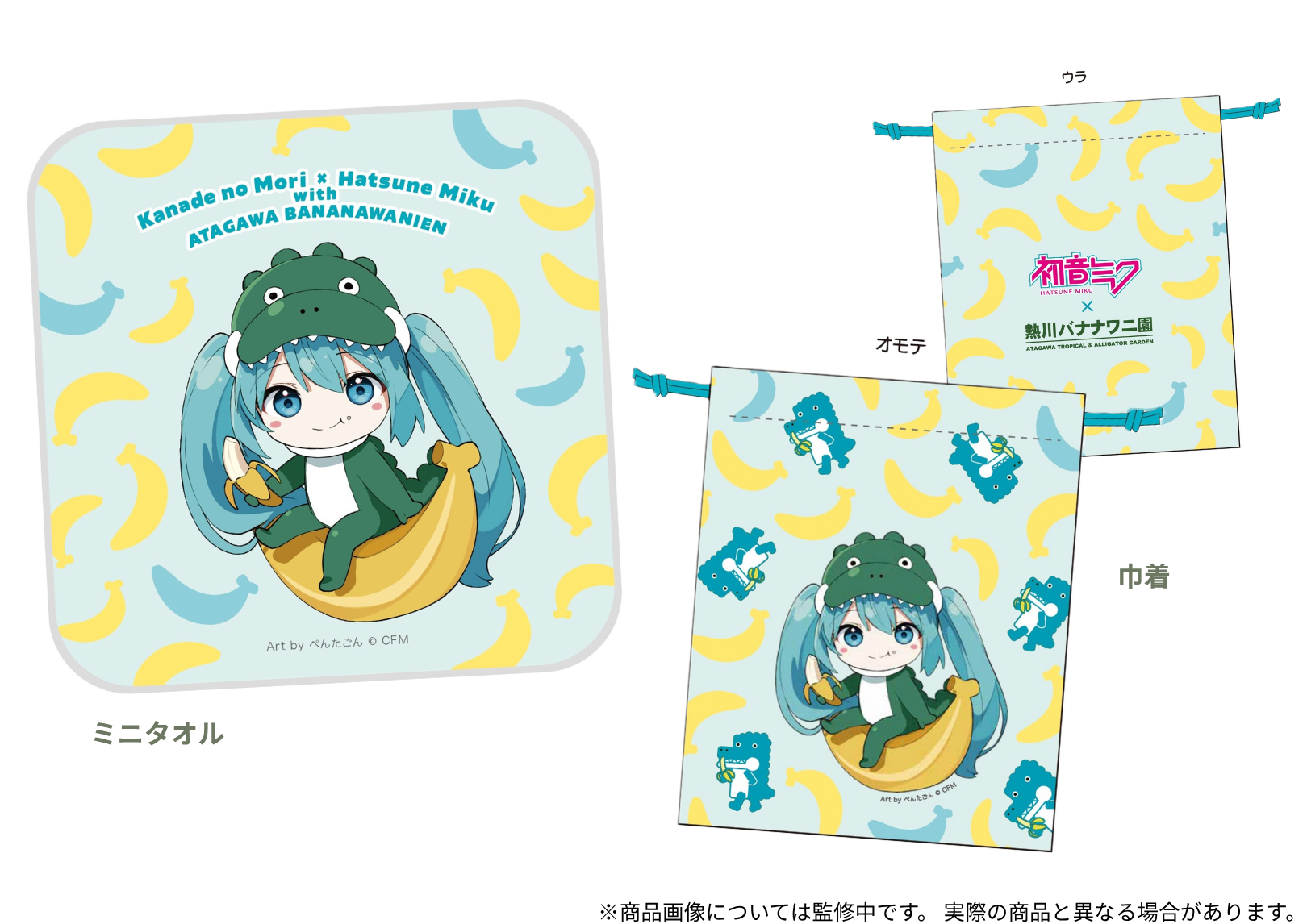 熱川バナナワニ園バージョンのアクリルキーホルダー、缶バッジ、ミニタオル、巾着を販売しています。
