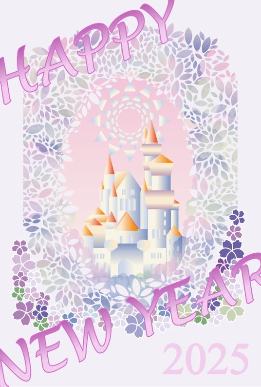 模様すべてを図形で作成しています。お城だけでなく、細かいレースのように見える葉っぱの模様もすべて図形で表現しており、レース部分から覗く部分も背景のグラデーションだけで妥協することなく透明度の高いカラフルな図形を配置することにより、水彩画のようなタッチを表現しています。こだわりぬかれた渾身の一枚です。