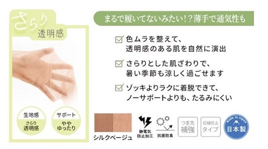 試供品としてお送りするのはセシールオリジナルの日本製ストッキング。色ムラを整えて透明感のある肌を自然に演出してくれる「さらり透明感タイプ」を1足プレゼントいたします。