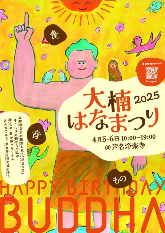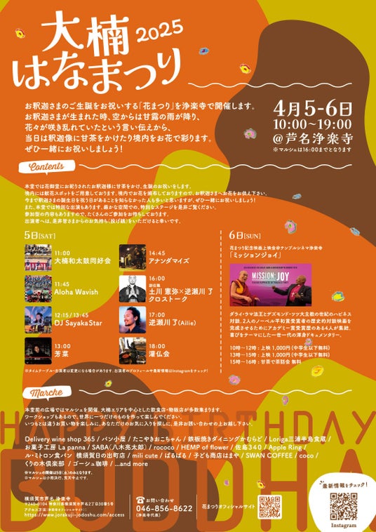 ハッピーバースデーブッダ!お釈迦様のご生誕をお祝いする「花まつり」を浄楽寺で開催します。春の空に舞う桜の花、響く音楽の調べ、おいしいごはんと雑貨たち。地域で支えあう手づくりのイベント「大楠はなまつり」は、誰もが主役となれるお祭りです。当日は灌仏会による甘茶かけや、映画上映、個性豊かなLIVE、多彩な出店者によるマルシェでお迎えします。浄楽寺は鎌倉時代の仏師・運慶作の仏像五体(すべて国指定重要文化財)が安置される古刹。仏さまの前で、あなたの春を祝いましょう。