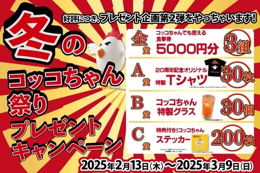 大好評すぎて第4弾やっちゃいます!『いただきコッコちゃん20周年記念』プレゼントキャンペーン!金賞は食事券5000円分が抽選で当たる!オリジナルTシャツやタンブラーも!なくなり次第終了。