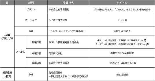 最高賞であるJAA賞グランプリは全6部門から、岩手日報社(2部門)、ライオン、サントリーホールディングス、ホクレン農業協同組合連合会、花王の各社が、また経済産業大臣賞は、宮崎県西都市とまちづくり西都KOKOKARAが受賞した他、全67作品が入賞しました。