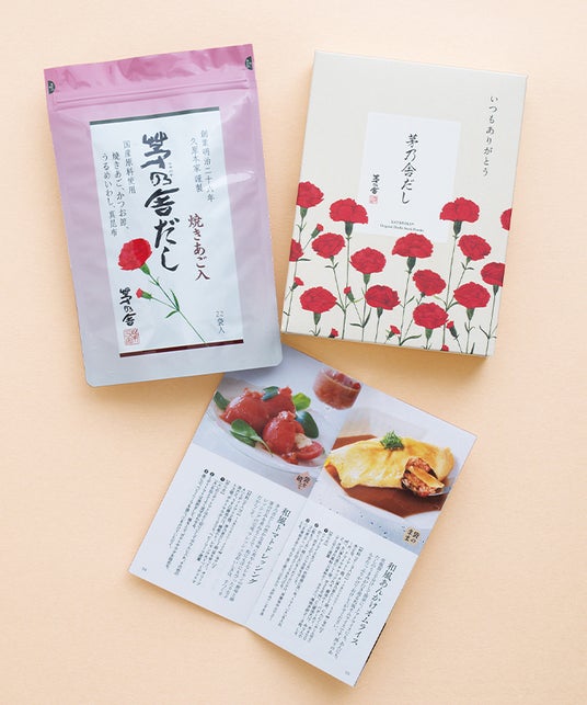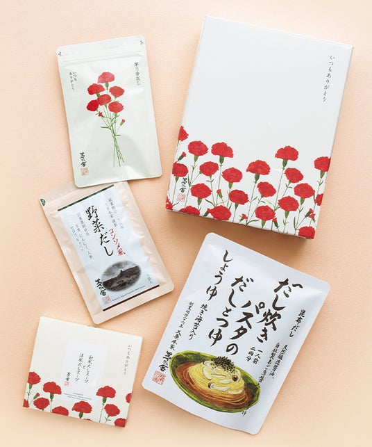 母の日限定パッケージの茅乃舎だしと野菜だし、だし炊きパスタなど、毎日の料理の手助けになる商品を詰め合わせたミニセット。