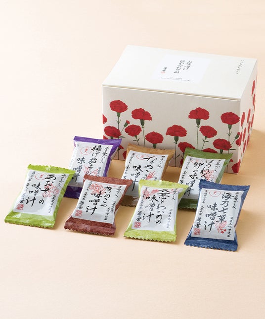 母の日限定のカーネーションパッケージの箱に、人気のフリーズドライ味噌汁全7種類を3食ずつ詰め合わせたセット。