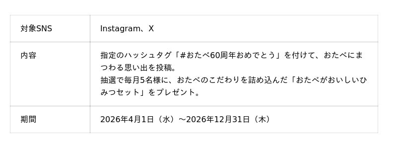 1. 【SNS参加型】「おいしい思い出」大募集60周年を記念し、お客様と「おたべ」にまつわるエピソードを募集します。