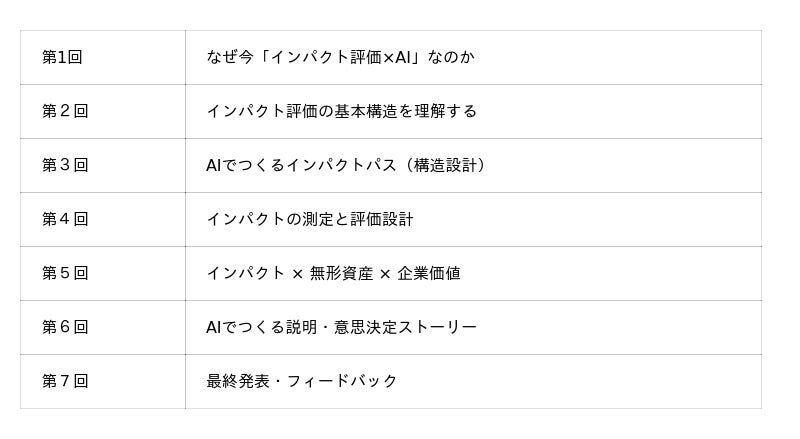 本講座は、理論理解にとどまらず、AIを活用して自社のインパクト評価を実際に完成させることを目的とした全7回の実践型プログラムである。