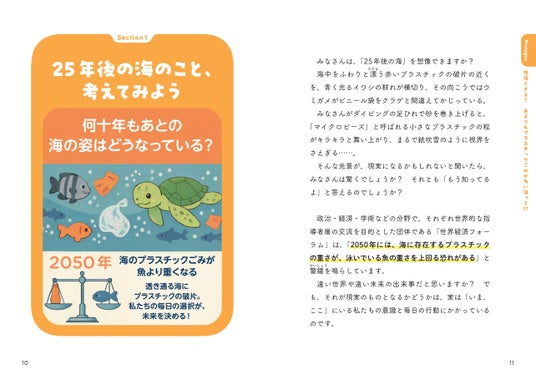 さらに、読者のみなさんが、実際に「今日使ったプラスチック」を数えるミニワークを紹介するなど、「気づくことが行動を変える第一歩」という本書のメッセージを体験的に理解できる構成。プラスチックの歴史、素材の種類と特性など、知識の面でも体系的にカバーしています。