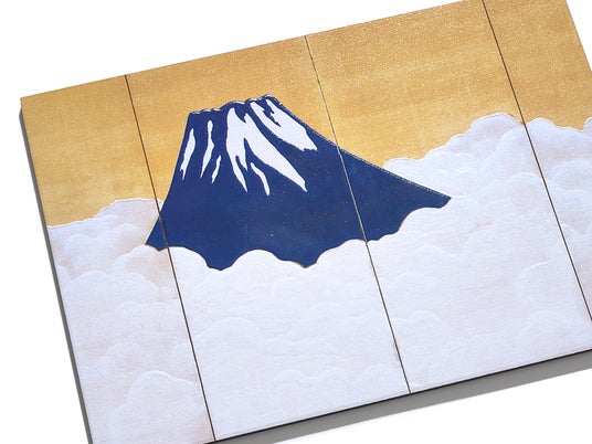 横山大観が生涯を通じて描き続けた「富士」をテーマにした大作の一つです。金地の屏風に広がる雲海から、残雪をまとった群青の富士が顔をのぞかせる様子が描かれています。富士山には大胆な高さをつけて立体化することで威風堂々とした姿を強調し、やわらかな雲海はグラデーション状の高低差をつけて、丸みのあるなめらかな質感を表現しています。シンプルな構図ながら、圧巻のスケールで描かれた作品のダイナミックな姿を立体化し、そのままポストカードに落とし込みました。大観の感じた富士の気高さに触れることができるアイテムです。