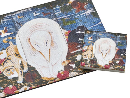 右隻の「獣づくし」には、霊獣を含む23種の動物が描かれています。こちらを見つめる大きな白象の圧倒的な存在感を引き立てつつ、周囲の個性的な動物たちの活気に満ちた様子を、原画に正確に写し取りました。約1cm四方の小さな枡目の中に色を塗り重ねる若冲独自の描法「枡目描き」を忠実に再現するため、高精細なデータから読み取った小さなドットのように見える枡目の一つ一つに高さを出し、手作業の凹凸アレンジを加えながら立体的に仕上げています。若冲の緻密な技法を指先で体感していただけるアイテムです。