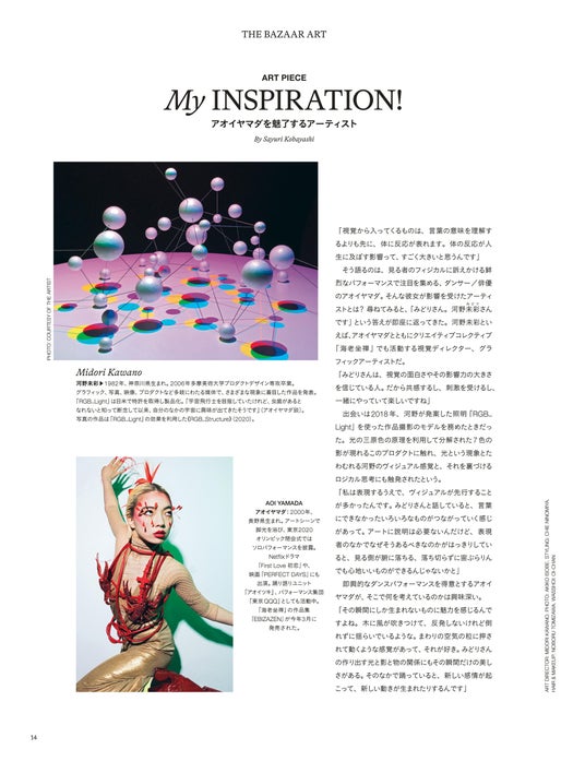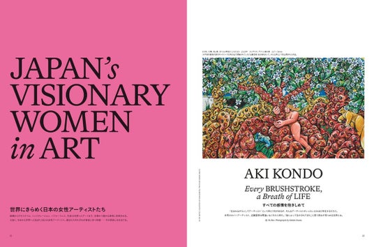 世界にきらめく6人の日本の女性アーティスト絵画からテキスタイル、インスタレーション、パフォーマンス、生成AIを使ったアートまで、多様かつ豊かな表現で世界を圧倒する日本の女性アーティストたち。今号のカバーアーティストであり、豊かな色彩と力強い筆使いで、一度目にしたら忘れられない作品を描く近藤亜樹さんや、東南アジアにおけるアートの一大発信地であるインドネシアから、人と土地のつながりを考察した、力強く鮮烈な作品を発表する今津景さんなど、日本から世界へ羽ばたく今注目の6人の女性アーティストと、彼女たちがそれぞれ背景に持つ物語を全40ページの大ボリュームでご紹介します。