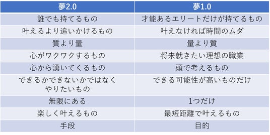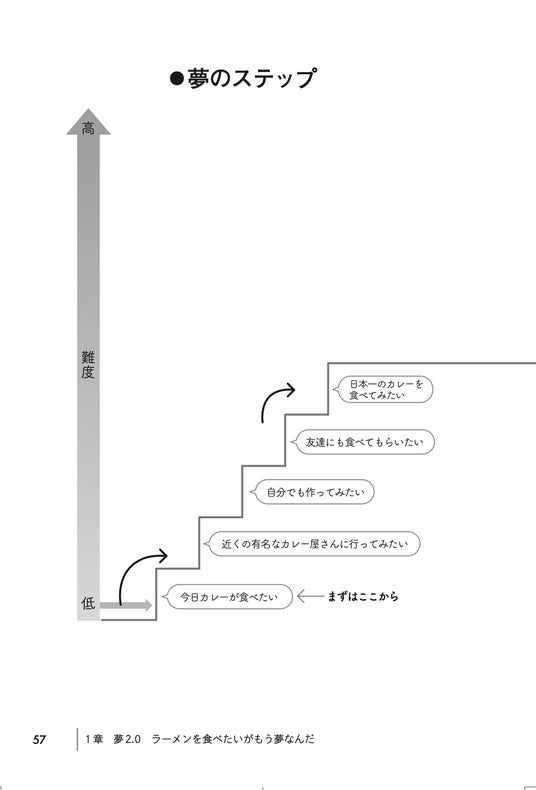 私たちは、「夢=将来就きたい理想の職業」と捉えがちです。この旧態依然とした夢の定義を「夢 1.0 」と呼び、「今日ラーメンが食べたい」「新しくできたあのお店に行ってみたい」といった「心がワクワクするものすべて」を「夢2.0」と定義します。例えば、「今日食べたいもの」のような些細なことも夢になります。「○○がしたい」を階段式に積み重ねることで、最終的には大きな夢の実現につながるという「夢実現理論」を本書でお伝えしています。