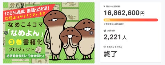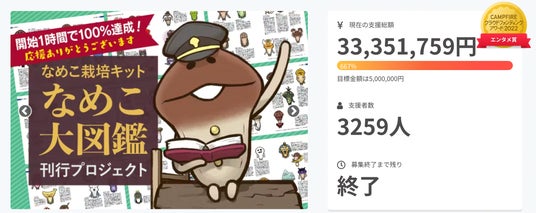 なめこのクラウドファンディングプロジェクトはこれまでに6回実施しており、累計支援額は1億円を突破するなど、大きな成果を収めています。