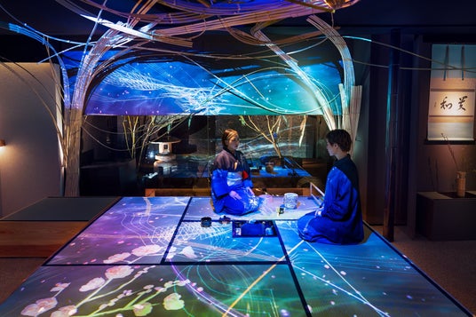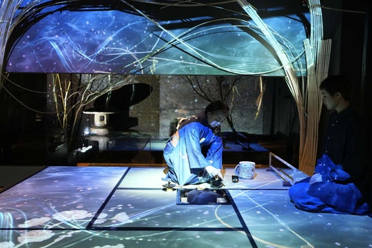「NIWA」店内には、光の茶室「貴和」を設置。茶道裏千家 千 宗室家元からいただいた「貴和」のお軸を中心に、伝統の継承と革新が融合する特別な空間が完成しました。京都の四神相応(※1)に基づく「東」の地をテーマに、いけばな草月流家元 勅使河原 茜氏による優美な竹のアート、近代日本庭園の先駆者とされる作庭家・小川治兵衞の造園技術を250年以上受け継ぐ、植治 次期十二代 小川 勝章氏による庭園、そしてネイキッドによるアートテクノロジーによって、京都の清らかな鴨川の水の流れと自然を感じさせる空間を表現しました。光の茶室は貸出も予定されており、詳細は公式サイトで案内予定です。