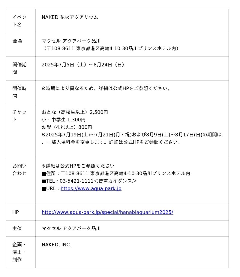 株式会社ネイキッド(英語表記:NAKED, INC. 、所在地:東京都渋谷区、代表:村松亮太郎)は、2025年7月5日(土)~8月24日(日)までの期間、マクセル アクアパーク品川にて、恒例となった大人気の夏季限定イベント『NAKED 花火アクアリウム』の企画・演出・制作を手がけています。